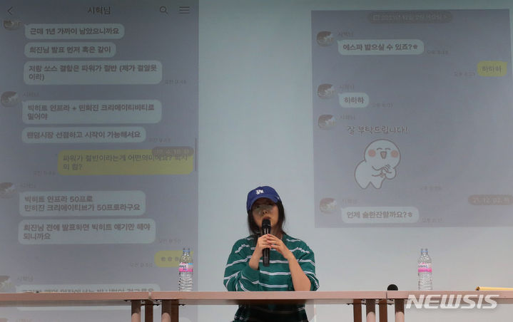 특히 지난해 3월25일 아일릿이 데뷔하기도 전에 민 전 대표와 측근들이 아일릿 공격 방법으로 음원사재기 프레임과 아일릿 표절의혹을 논의했다는 카톡 대화 등을 증거 자료로 제출했다.