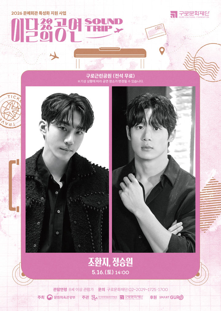 2026 이달의 공연 ‘사운드트립’은 문화체육관광부가 주최하고 한국문화예술회관연합회와 구로문화재단이 주관하며 구로구가 후원하는 2026 문예회관 특성화 지원 사업의 일환으로 진행된다. 구민들이 일상에서 공연예술을 경험할 수 있도록 기획된 시리즈로, 상반기에는 야외공연, 하반기에는 공연장 공연으로 이어진다.