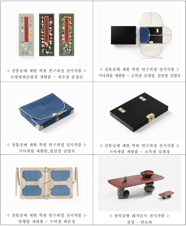 ‘전통공예 재현·복원 연구과정’ 참여 전승자들은 ‘물건을 담는 공예품’을 주제로 유물을 재현했다. 국보 ‘기사계첩 및 함’, 동국대박물관이 소장한 ‘금광명최승왕경’ 자수 표지, 옛길박물관 소장 말행낭 등을 재현했다.