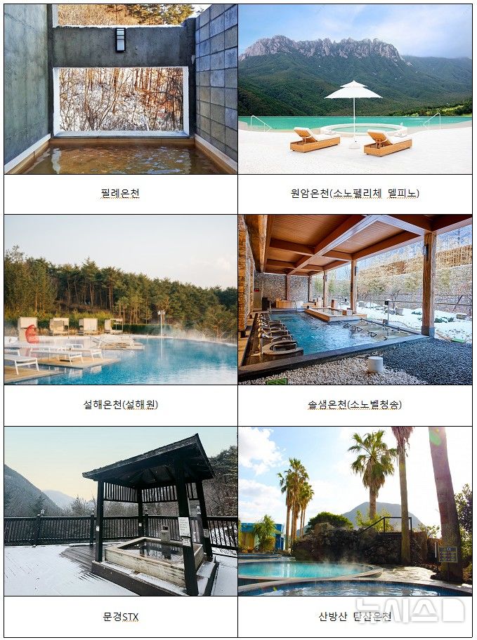 이번에 선정된 온천 6곳은 설악산·속리산·주왕산 등의 아름다운 설경을 바라보거나 동해 바다 및 제주 화산 지형 등 이색적인 풍경과 함께 노천탕을 즐기며 겨울의 정취를 느낄 수 있는 것이 특징이다.