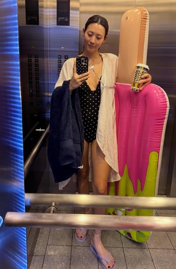 사진에는 수영장에서 휴식을 즐기는 모습과 엘리베이터 거울 앞에서 촬영한 셀카 등이 담겼다.