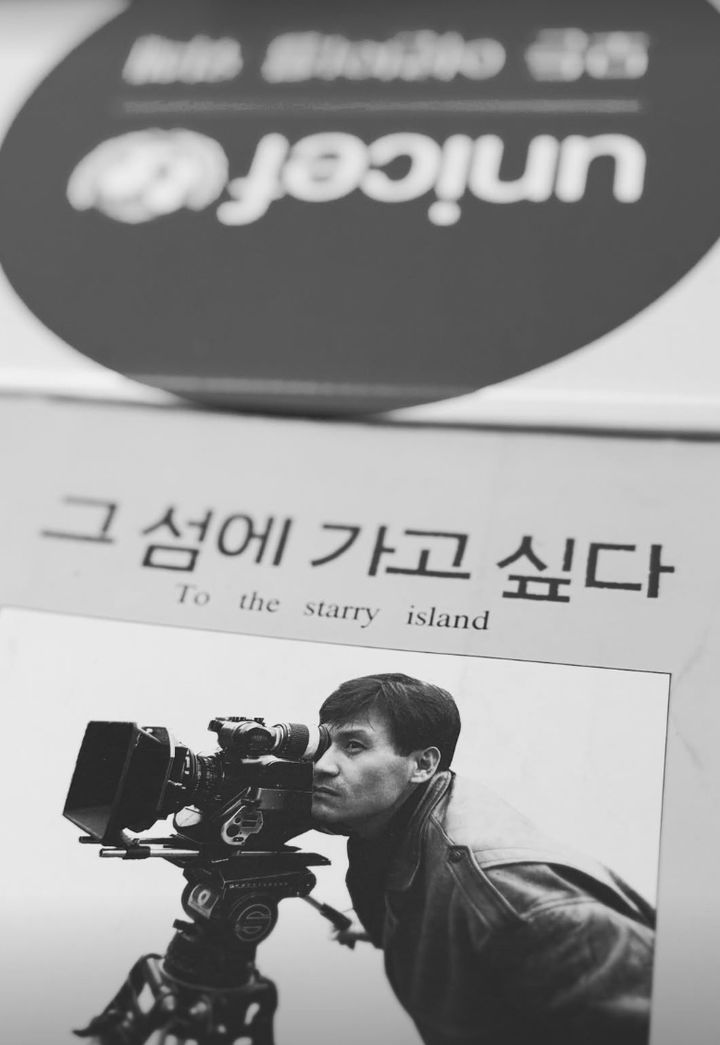 사진에는 영화 ‘그 섬에 가고 싶다'(1993) 촬영 당시 카메라 렌즈 너머를 응시하고 있는 안성기의 모습이 담겼다.