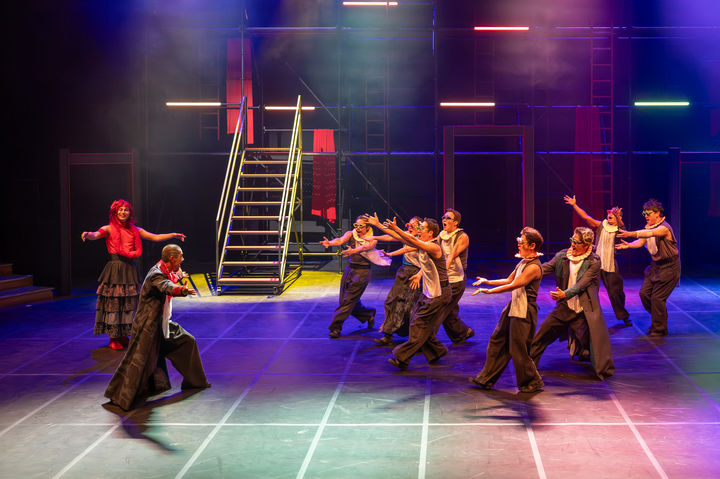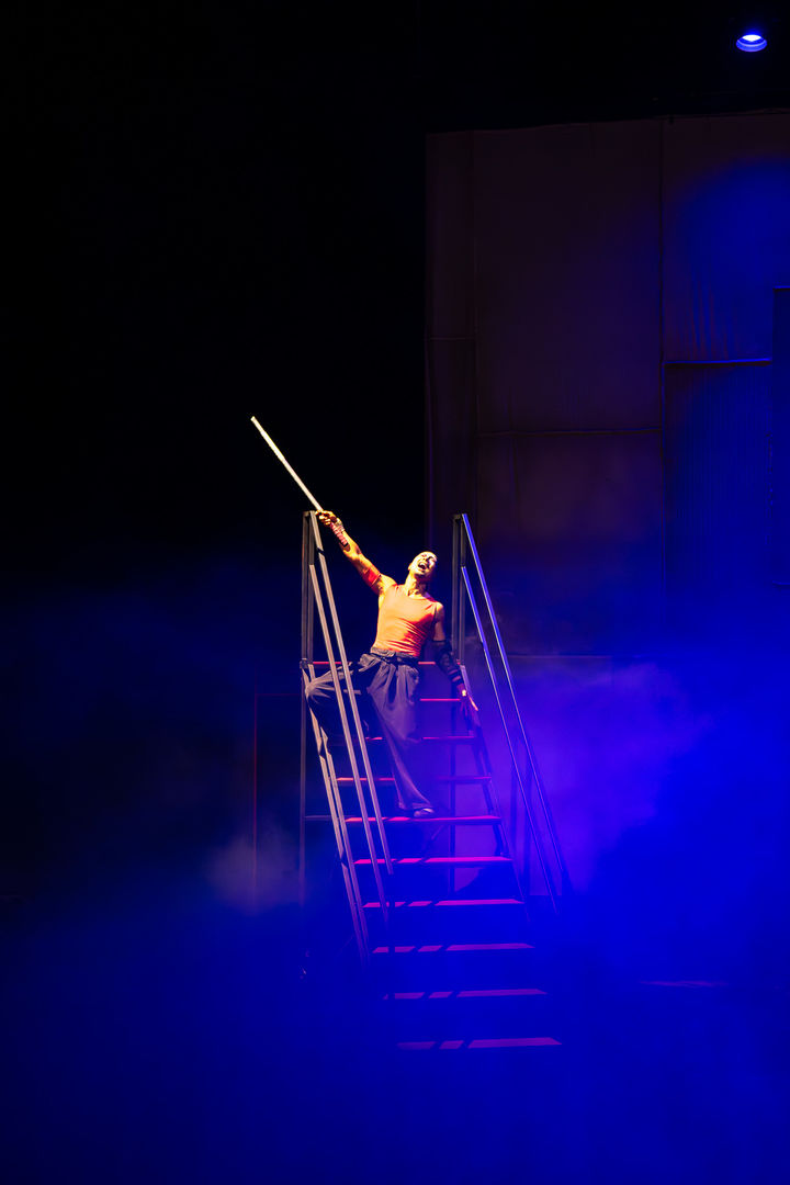 무대 위에는 배경인 철제 구조물을 제외하고 별다른 장치가 없다. 그러나 구조물 속 사다리와 봉, 극장의 여러 입구와 관중석까지 활용해 배우들은 무대 안팎을 넘나들며 역동적인 공간 활용을 보여준다.