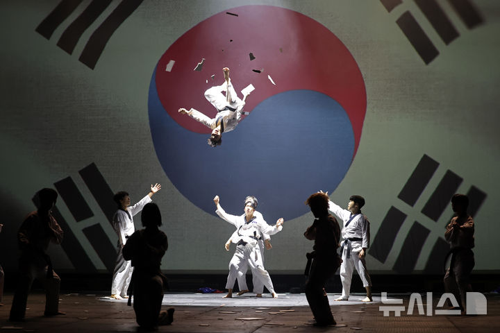 [서울=뉴시스]김주희 기자 = 공중제비는 물론, 송판 격파까지 거침없이 이뤄진다. 뮤지컬 ‘태권, 날아올라’가 역동적인 태권도 퍼포먼스에 서사와 음악이 어우러진 특별한 무대를 선보인다.