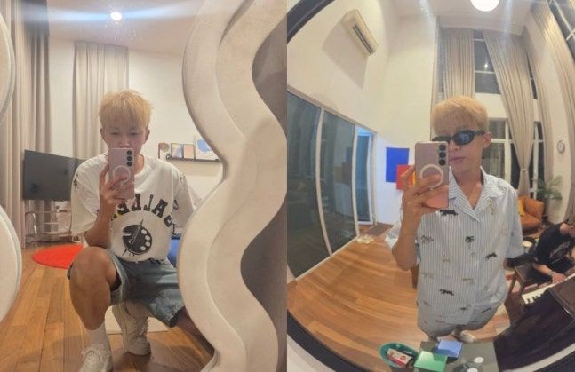 흰색 티셔츠와 반바지 차림의 편안한 복장으로 쪼그려 앉아 사진을 찍는가 하면, 셔츠에 선글라스를 착용한 채 또 다른 거울 셀카를 남기며 여유로운 분위기를 드러냈다.