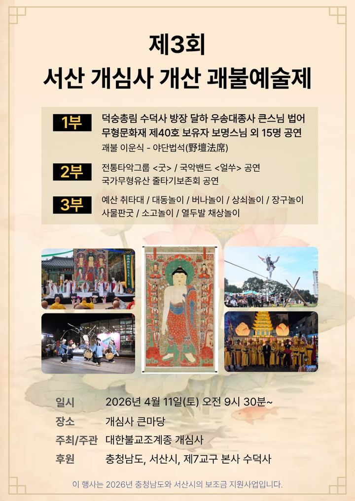 5일 개심사에 따르면 이번 예술제는 충남도와 서산시, 대한불교조계종 제7교구 본사 수덕사가 후원한다.