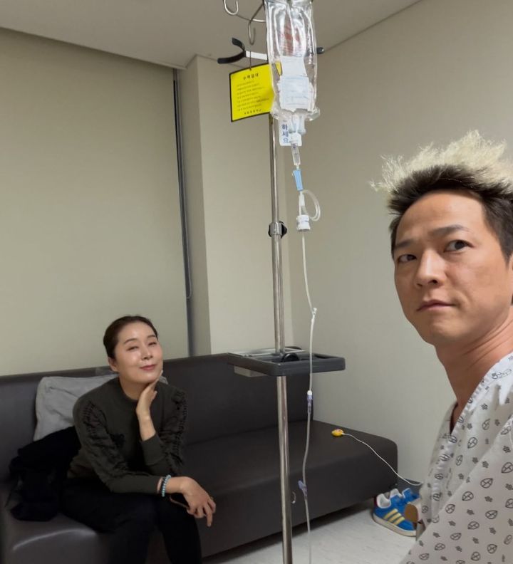 사진에는 병원복을 입고 수액을 맞고 있는 팝핀현준의 모습과 함께, 아내인 국악인 박애리가 병실에서 간병을 하고 있는 모습 등이 담겼다.