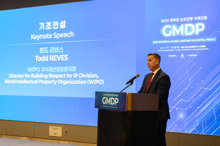 제리 토드 리브스 세계지식재산권기구(WIPO) 지식재산권보호국장은 17일 서울 마포 호텔 나루 서울 엠겔러리에서 열린 ‘2025 저작권 보호 집행 국제포럼 및 인터폴 디지털 불법복제에 관한 글로벌 회의(GMDP)’에서 기조연설을 통해 콘텐츠 저작권 보호를 위한 국제적인 협력의 중요성을 환기시키고 참여를 독려했다.